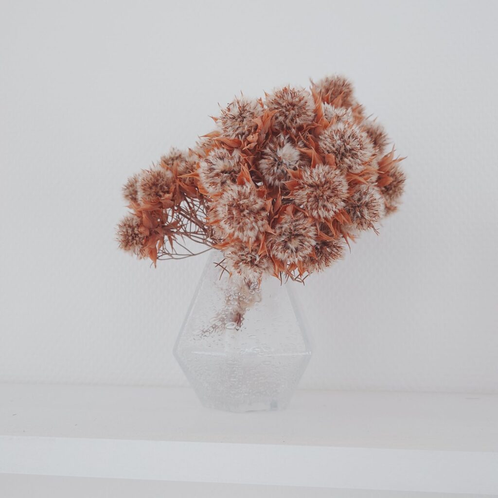 Francfrancのフラワーベースにドライフラワーを飾った様子